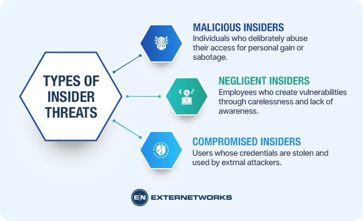 Each category requires different mitigation approaches—from behavioral analytics for malicious actors to security awareness training for negligent users.
