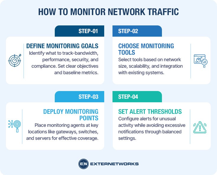 Begin by identifying what you need to track. Common objectives include bandwidth utilization, application performance, security threat detection, and compliance requirements. Clear objectives guide tool selection and ensure monitoring efforts align with business priorities. Document baseline metrics before implementing changes.